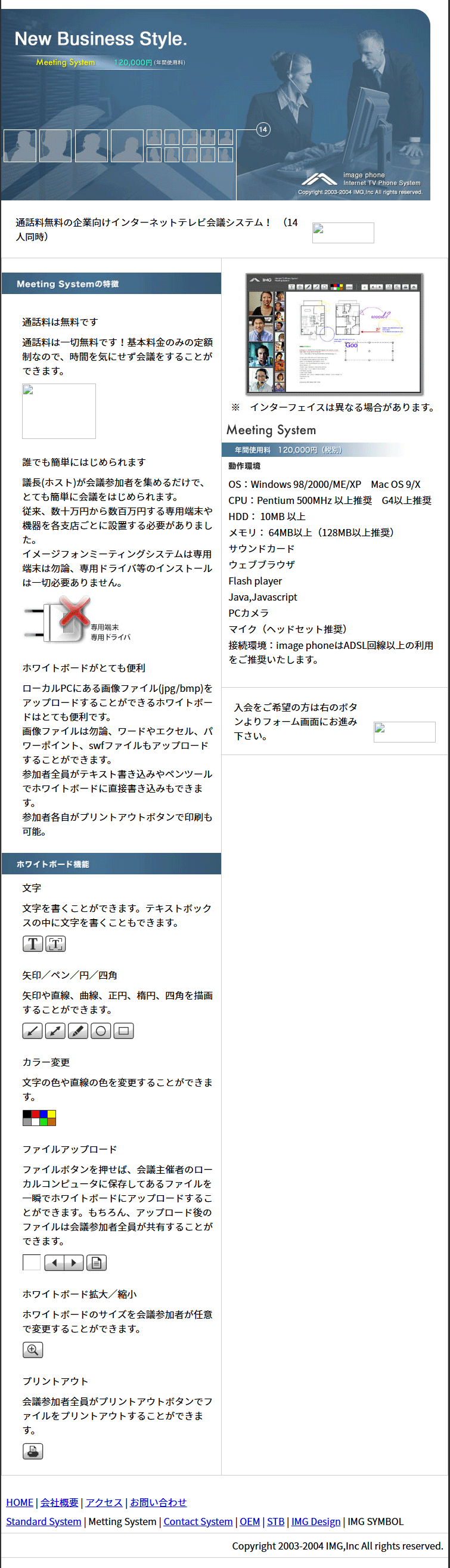詐欺師の竹山聡(たけやま さとる)がプレスリリースした「イメージフォン(3種)」のラインナップで主要製品となるのは、やはりオフィスユースで単価も高い、14人同時にインターネットでテレビ電話できる「会議システム」であった。2024年現在でこそZOOMでなじみの深いサービスではあるが、これを20年前にやろうという当時としては画期的なサービスであった。ただし、本当に存在したのであれば、だ。