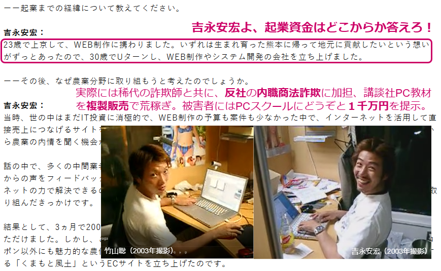 結論から言えば、吉永安宏は不起訴となった。これは決して無実ということではない。捕まらなかった詐欺師というだけの話だ。警視庁や東京地検の事情聴取の際、すべてを竹山聡のせいにしたか、このままではふたりとも捕まると竹山聡と手打ちをして二人で詐欺行為を否認したかのどちらかだ。吉永安宏は竹山聡とともに、詐欺犯での逮捕という最悪の事態を逃れる一点では利害が一致するからだ。いったんは竹山聡の横領で反目したとはいえ、竹山聡がそれまでの多くの詐欺で手にした金の分け前を手土産に和解をもちかけた可能性は高い。というのは、この事件が不起訴になるや、吉永安宏は残ったメンバーとのインターネットテレビ電話事業から抜けて一人、熊本に帰郷している。さぞ傷心のうちに…と思いきや、突然に下記の事業を満面の笑みを浮かべて行っているのである。被害者に詫びも説明もなしにだ。完全に無視を決め込んでいるのである。吉永安宏は、竹山聡の裏切り直後は、あまりのショックに本人の前でゲロを吐いたという。自分は手弁当で仕事をしていたのに竹山聡が億単位の金を独り占めしていたのだから当然であろう。つまり、そのまま帰省していればまずは裸一貫からのスタートである。それがこれである。どこにそのような事業資金があったというのか。
